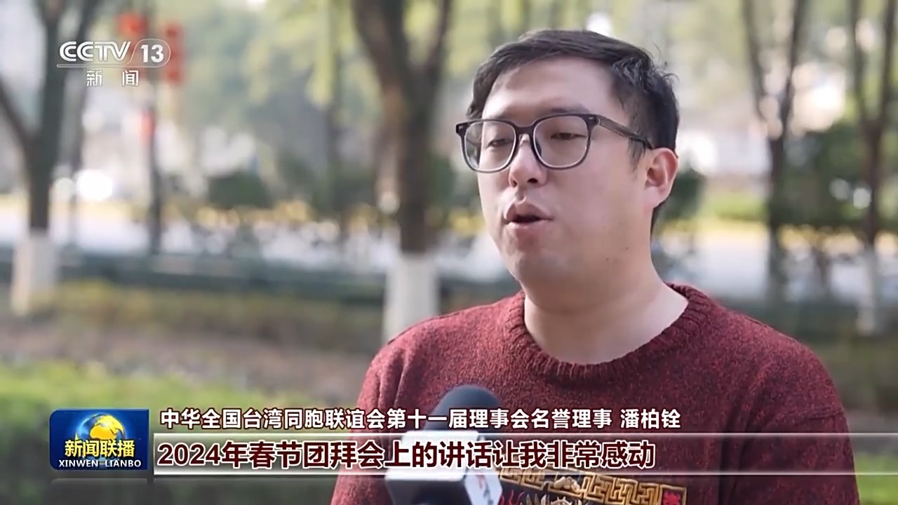 中华全国台湾同胞联谊会第十一届理事会名誉理事 潘柏铨:2024年春节团拜会上的讲话让我非常感动,其中包含着我们全体中国人对未来的美好憧憬。那未来也希望更多的台胞们,可以来大陆走走看看,投资、创业、旅游,一同搭上高速发展的这个列车,一起享受这片沃土带来的更好的机遇。