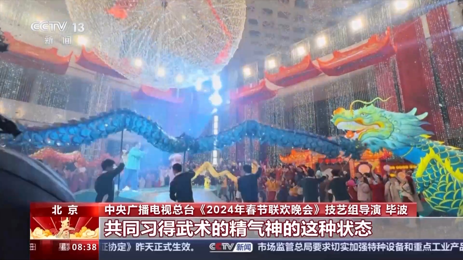 中央广播电视总台《2024年春节联欢晚会》技艺组导演 毕波:我们能够从各种各样的细节中,无论是视觉意向还是音乐意向,让观众能够建立这三个武术明星和那三位宗师之间千丝万缕的关系,有带领众人共同习得武术的精气神的这种状态,这个是我们最希望传达的。