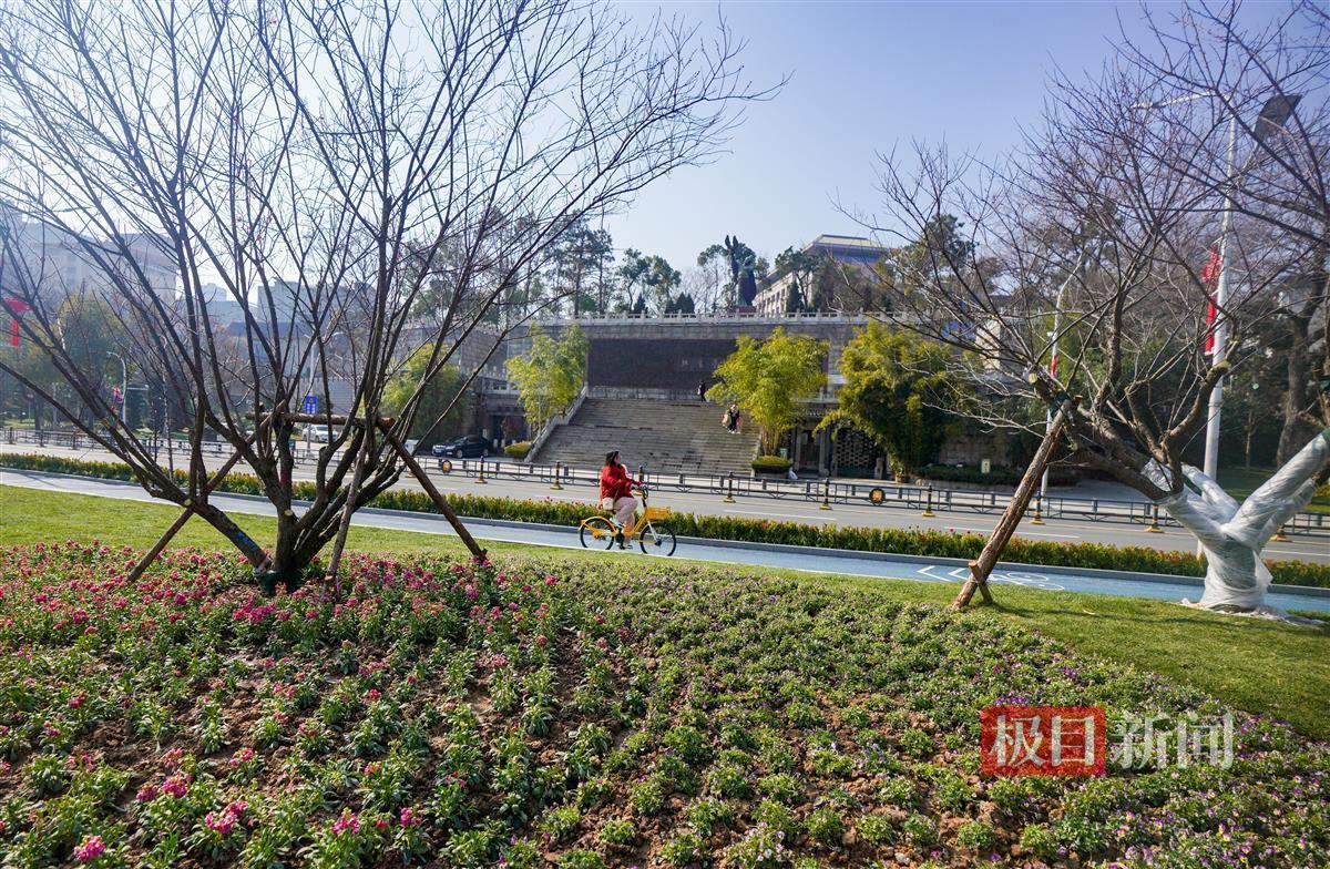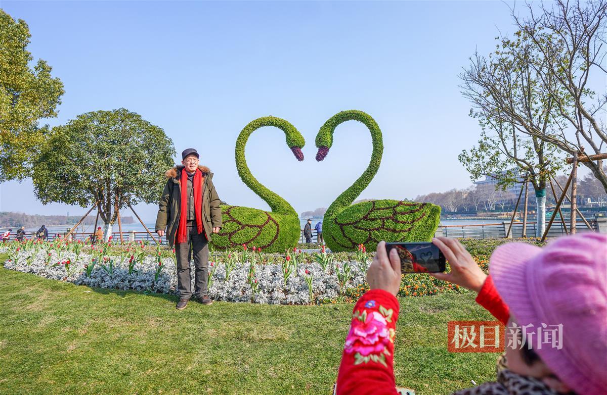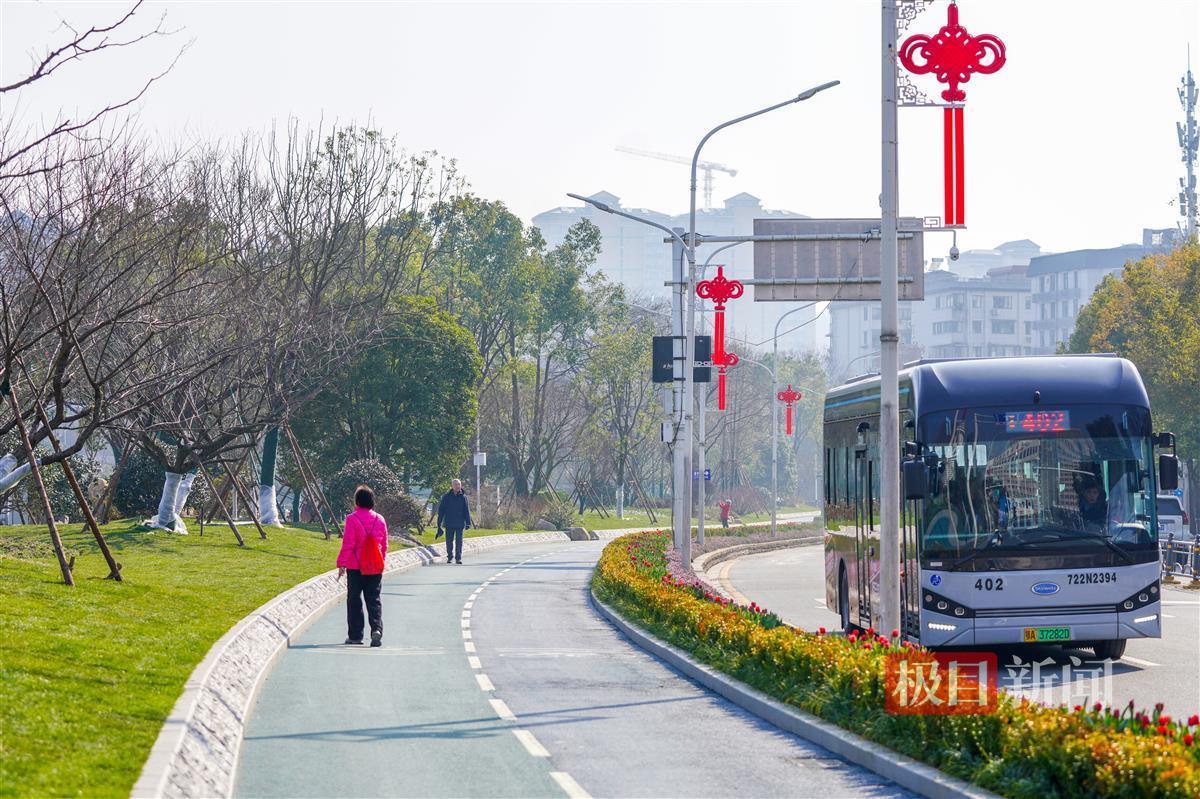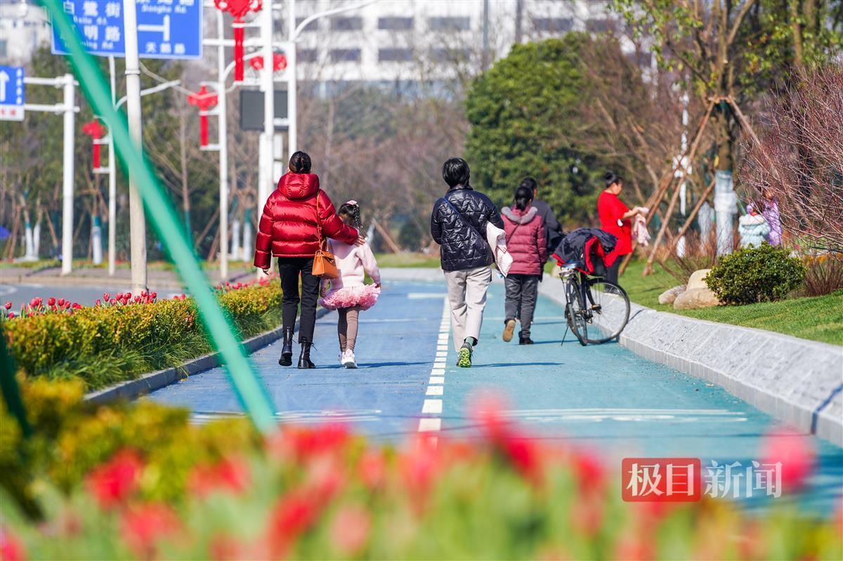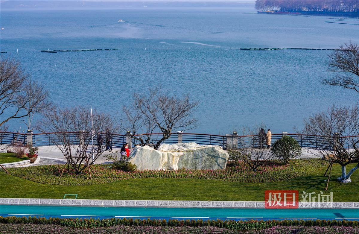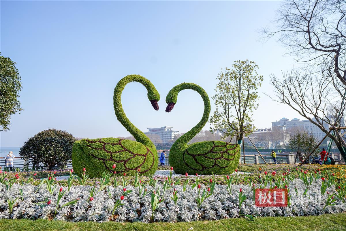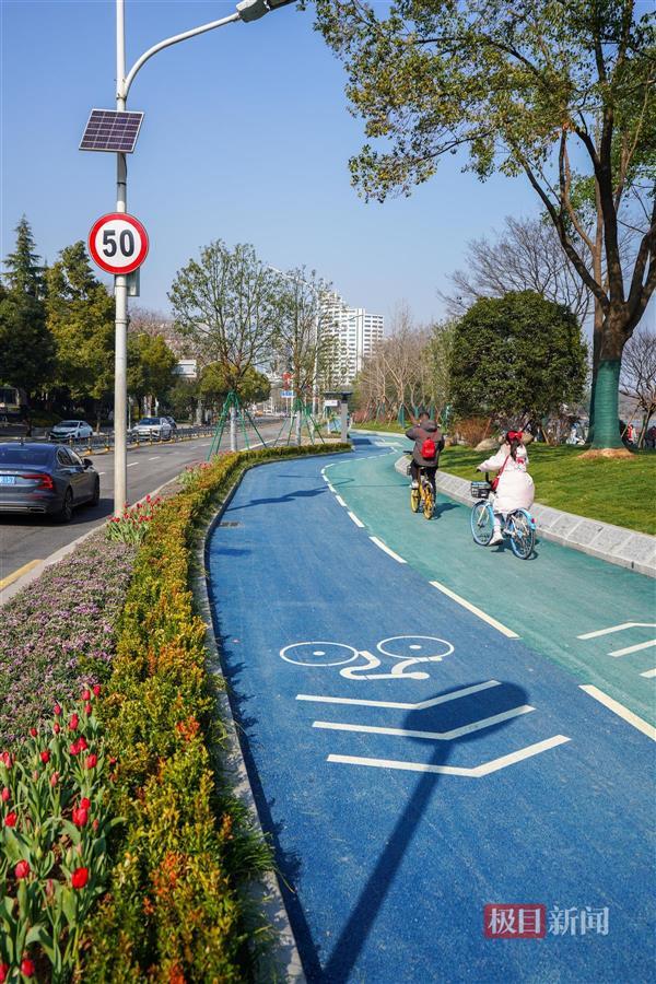 当天下午,极目新闻记者现场看到,新增的绿道有3.5米宽,可双向骑行。为保证骑行安全,靠机动车道一侧还设置了一道绿化带。靠近双湖桥段,则新建了一个石矶长滩,游客可零距离亲水。此外,在绿道与亲水平台之间的绿化带上,还新增了两只天鹅绿雕,在团花簇拥下,绿雕景观显得更优美。