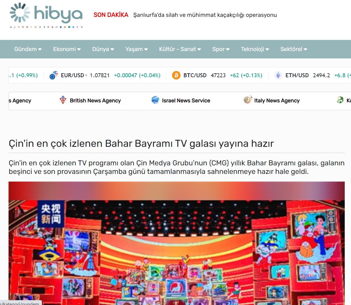 此外,阿联酋国家通讯社、土耳其希比亚通讯社、叙利亚复兴报、阿尔及利亚丝路新闻网等多家媒体官方网站对总台龙年春晚以及相关新春活动都做了报道。其中土耳其希比亚通讯社在该通讯社官方网站开设“总台春晚专栏”,十余篇报道递进追踪春晚动态。报道指出,今年的春晚融合了尖端技术,实现沉浸式舞台互动,是春节期间的必看节目。