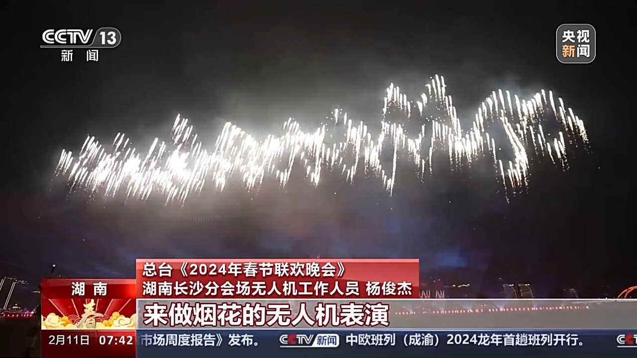 总台《2024年春节联欢晚会》湖南长沙分会场无人机工作人员 杨俊杰:首次搭载了2500架无人机来做烟花表演,这也是全国最大的一次烟花无人机的表演秀。