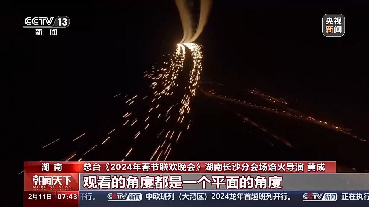 总台《2024年春节联欢晚会》湖南长沙分会场焰火导演 黄成:原来我们的布阵都是平面布阵,观看的角度都是一个平面的角度,但这一次首次采用400米直径的立体布阵,让整个烟花更加有立体的感觉。
