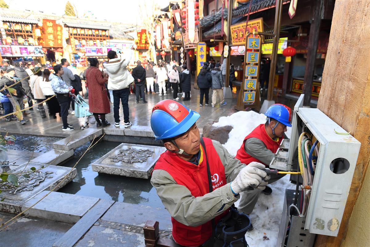 在木兰花乡核心景点的木兰不夜城里,熙熙攘攘的人流将过年的节日氛围拉满。古色古香的街道上,游客川流不息。东市大街的人群中,几位头戴安全帽、身穿红马甲的保电人员穿插而过,径直走向场地侧面的一座电压箱。