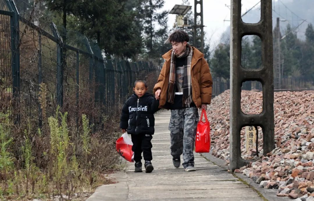 二儿子秦猛牵着5岁的弟弟秦浩宇