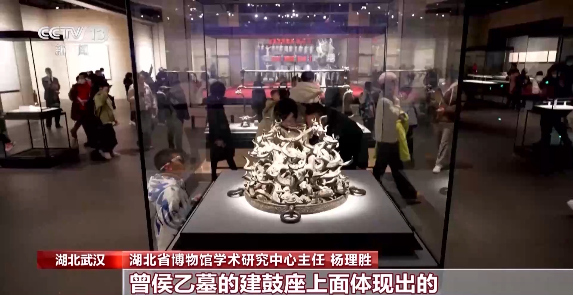 湖北省博物馆学术研究中心主任 杨理胜:建鼓座其实从发掘报告的时候,它就没有把龙有多少数量数清楚,只提到了它有八对主龙。其实在它的躯干上面,又会有一个龙长出来,龙上长龙,这样子全部纠结在一起,不是特别好数。有外国游客过来,想把这个龙有多少条数清楚,数了很多遍,他的结论是108条,但是事实上换一个角度,可能就数的数又不一样了,它是一件孤品。