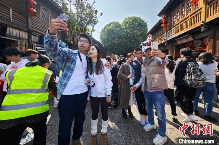 游客在三坊七巷历史文化街区“爱心树”前“打卡”。中新网记者王东明摄