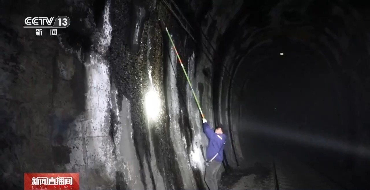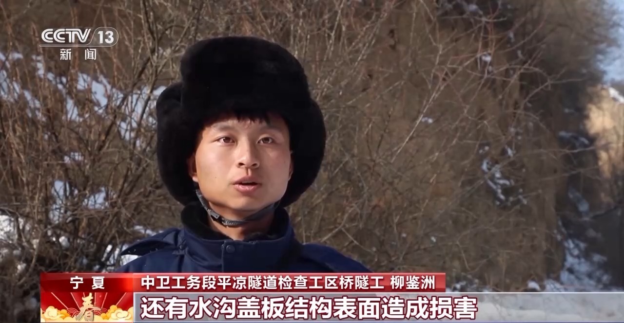 中卫工务段平凉隧道检查工区桥隧工 王顺:虽然我们定期进行清理打冰,但是由于山区温度比较低,这个冰很快就会重新长出来,所以我们要经常去进行清理。不仅要把隧道顶上的冰清理掉,而且要去把下面边墙或者说是枕木头上的冰也清理掉。