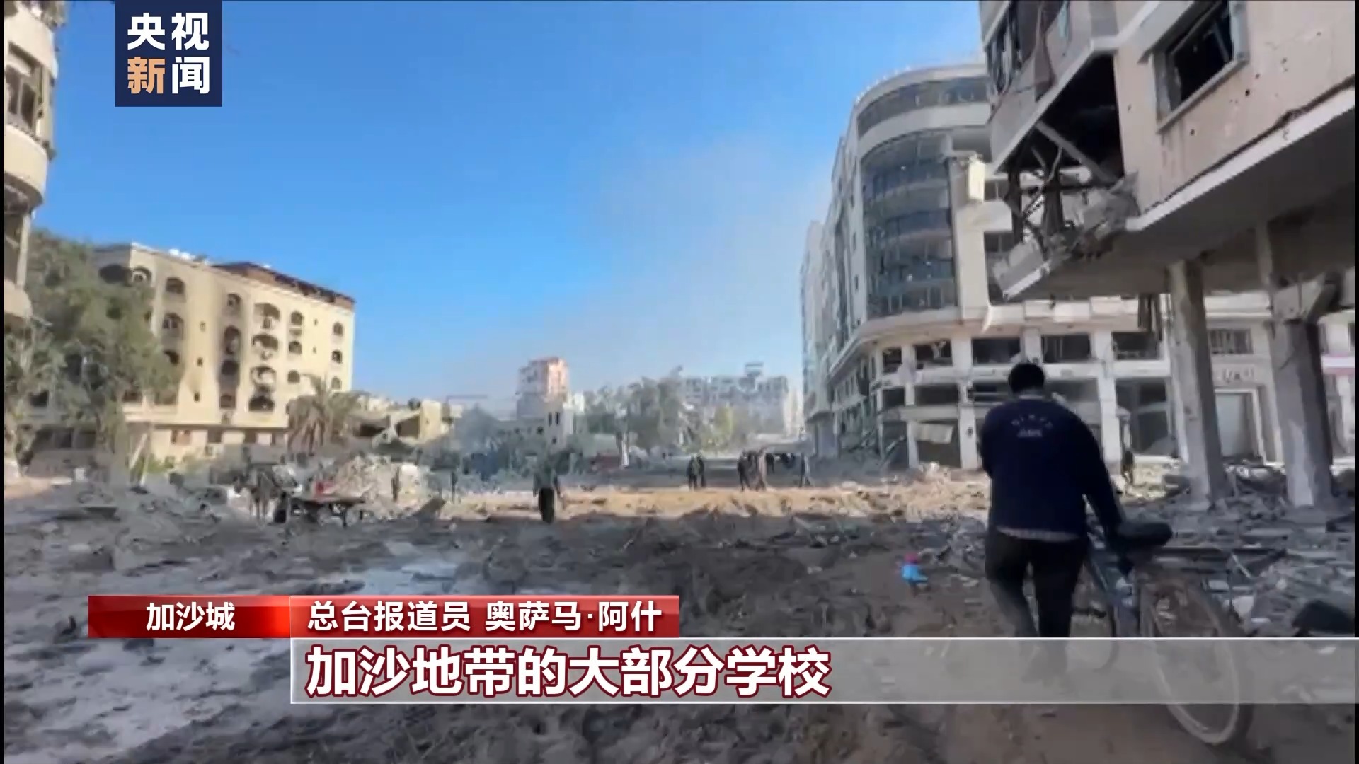 总台报道员 奥萨马·阿什:对于当地人来说,非常重要的一点是,阿克萨大学是一所政府大学,也被认为是一所为当地穷人开设的大学,因为学校的注册费和学费都很低,这个校区被摧毁就意味着附近绝大部分学生没有地方再继续学业。这样的情况也不仅仅出现在这一个校区里面,就连阿克萨大学在汗尤尼斯的总部也未能幸免。加沙地带的大部分学校都遭受到了不同程度的破坏。