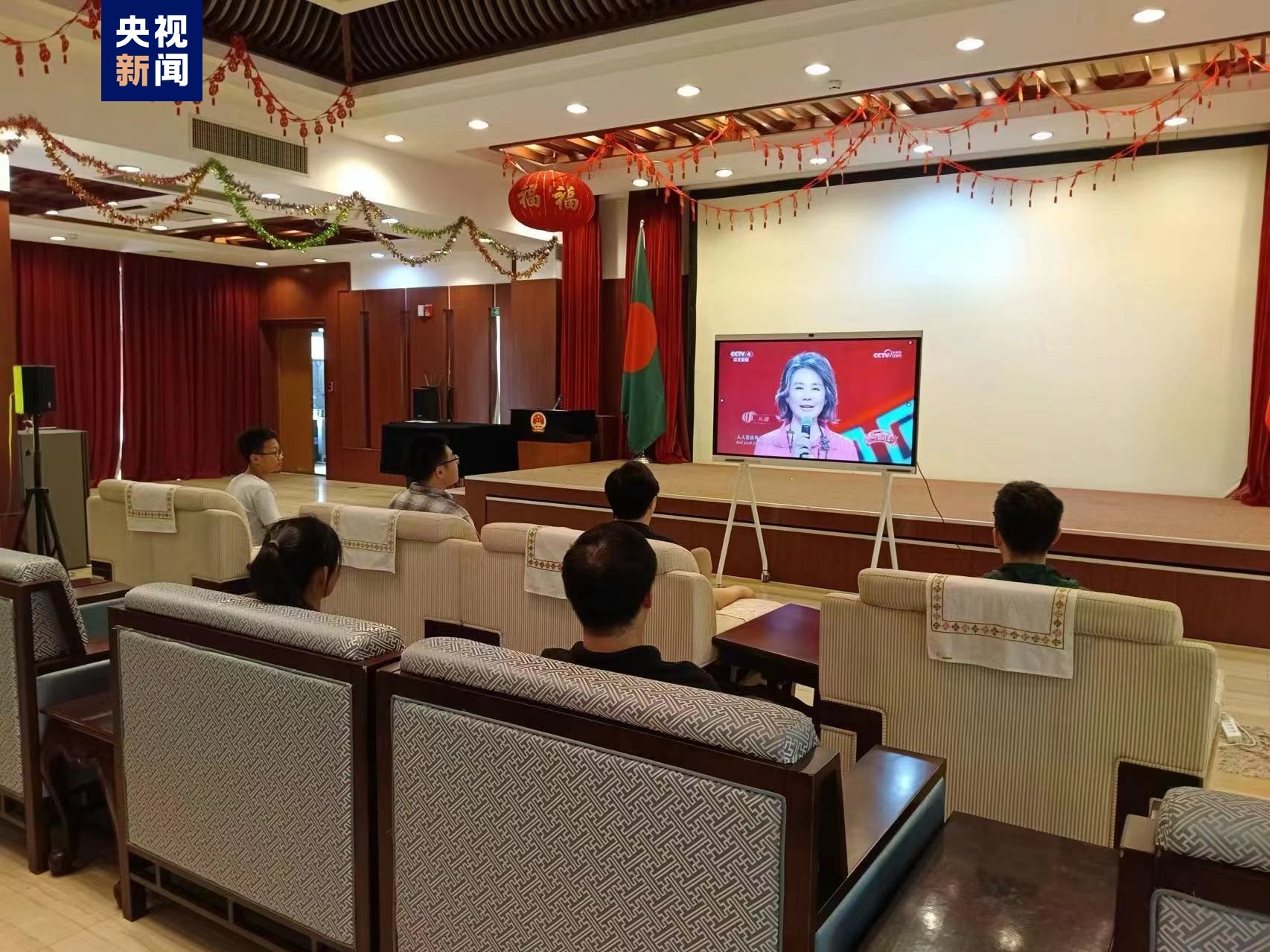 △中国驻孟加拉国使馆组织馆员收看晚会