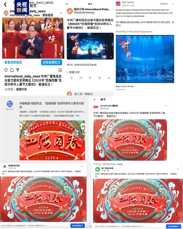 多家海外媒体持续对晚会进行关注、报道,总台国际传播规划局和国际交流局积极推广晚会节目海外落地。2024年2月9日至10日,“一带一路”重点建设项目暹粒吴哥国际机场、中老铁路屏幕等地推广《2024 年“四海同春”全球华侨华人春节大联欢》相关内容,全球华侨华人反应热烈。