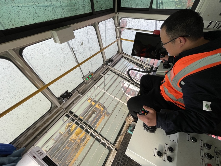 这是湖南岳阳城陵矶港国际集装箱码头的岸桥司机在装卸集装箱。新华社记者 余春生 摄