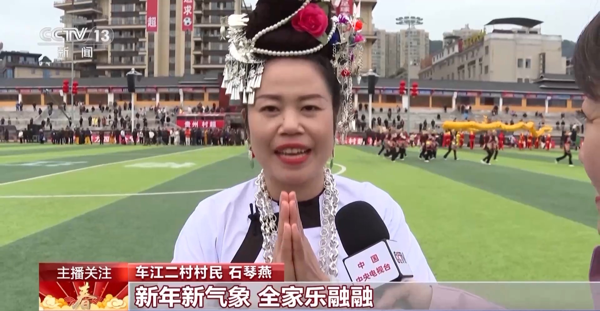 贵州榕江车江二村村民 石琴燕:祝大家身体健康,新年新气象,全家乐融融。(记者:对每一个人都说祝福,为什么?)因为有大家的支持,我们“村超”才能做得这么好,所以我要给大家全部的祝福。自从去年“村超”出圈了以后,我们家乡真的变化很大,感觉非常有活力了,充满了生气。