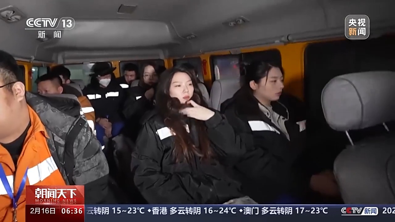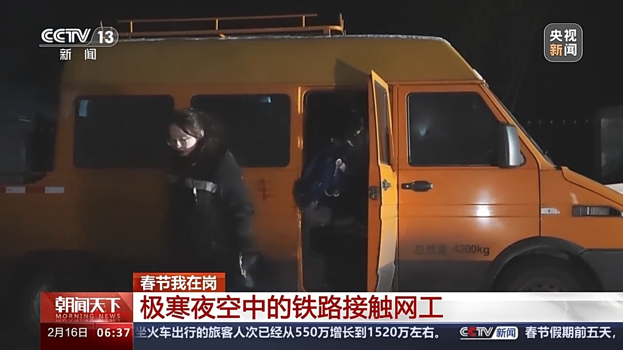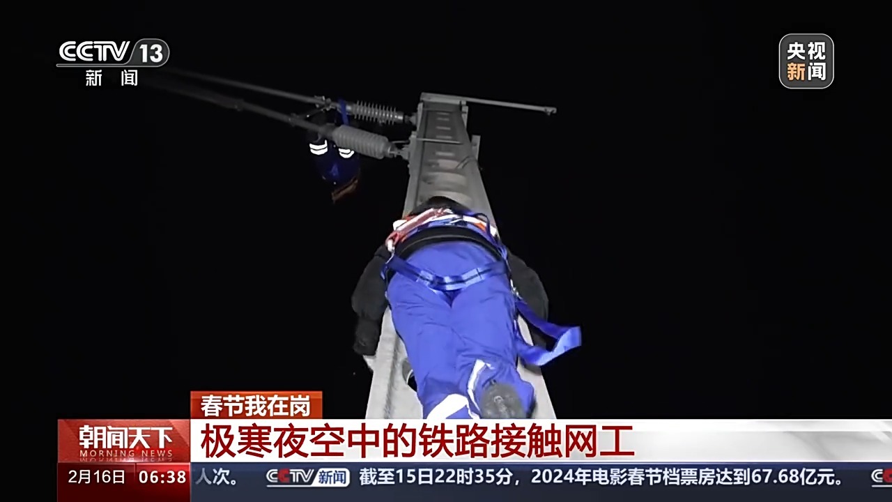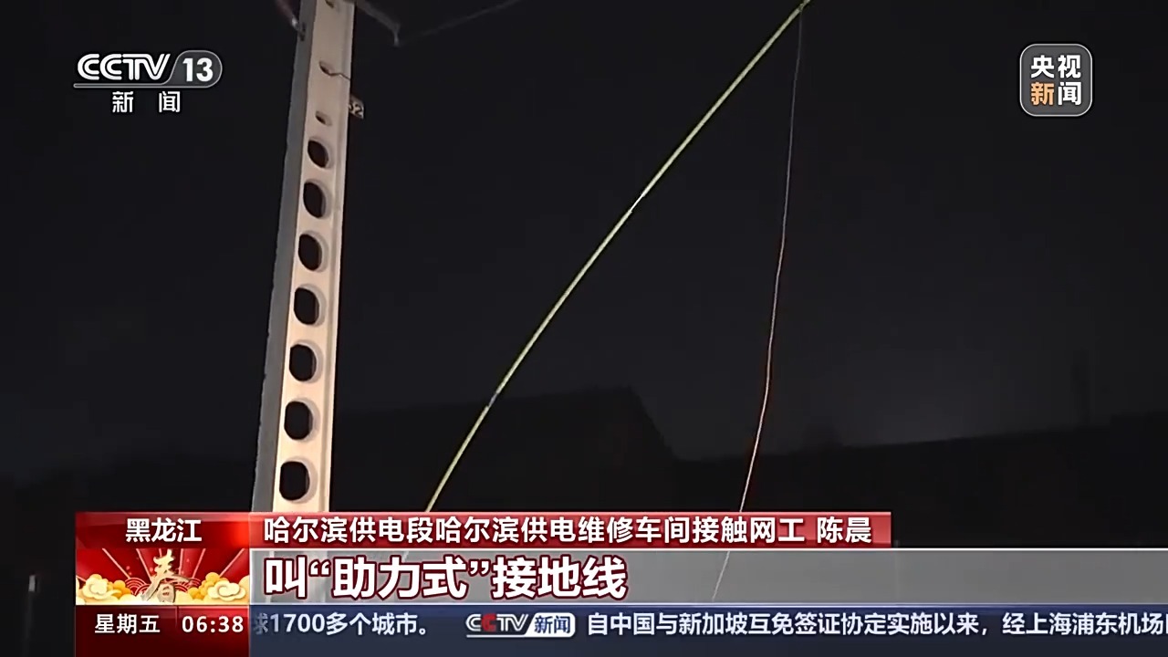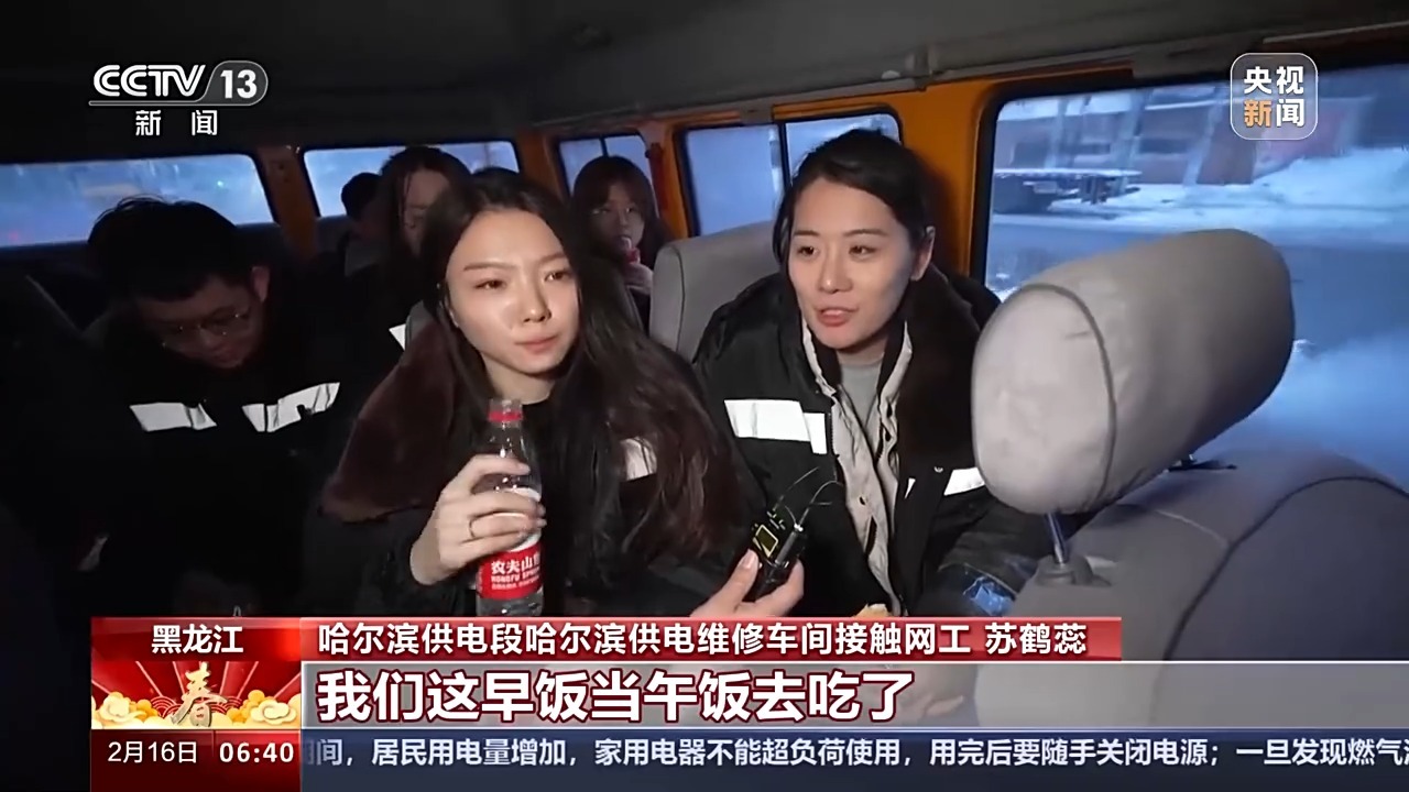 哈尔滨供电段哈尔滨供电维修车间接触网工 苏鹤蕊:我们这早饭当午饭去吃了,然后中午我们补个觉,回哈尔滨去打算去中央大街溜达溜达。我们工作性质就是让祖国各地朋友平安顺畅到达哈尔滨。