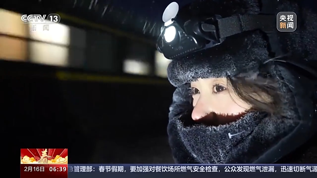 哈尔滨供电段哈尔滨供电维修车间接触网工 苏鹤蕊:冬天的时候可能上下睫毛会粘在一块,比较冷嘛,我们平常作业的时候,手里都拿着工具倒不开手,就得把眼睛使劲睁一下,让这个霜弄下去。