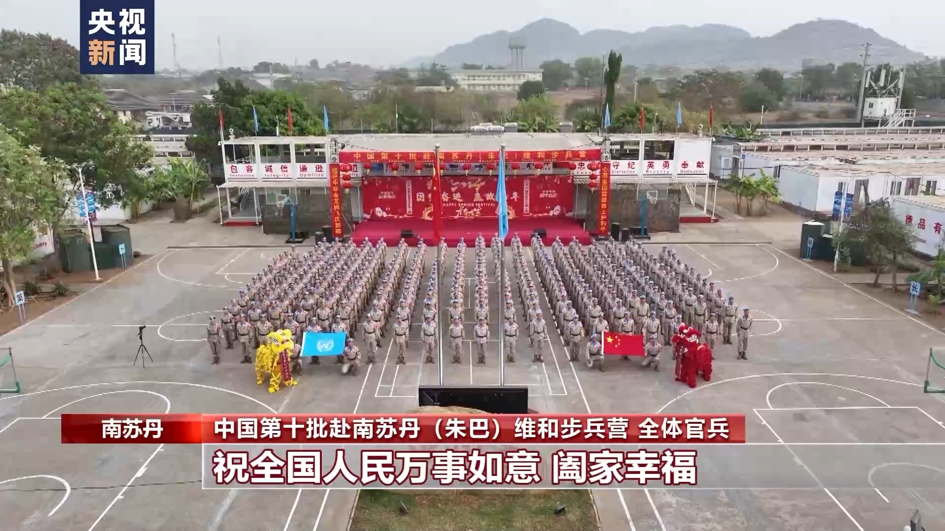中国第十批赴南苏丹(朱巴)维和步兵营 全体官兵:祝伟大祖国国泰民安、繁荣昌盛。祝全国人民万事如意、阖家幸福。春节我在岗,祖国请放心。我们一定不负重托、不辱使命,坚决完成维和任务。