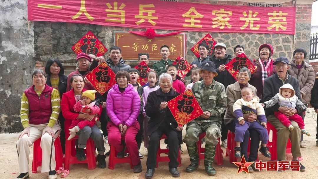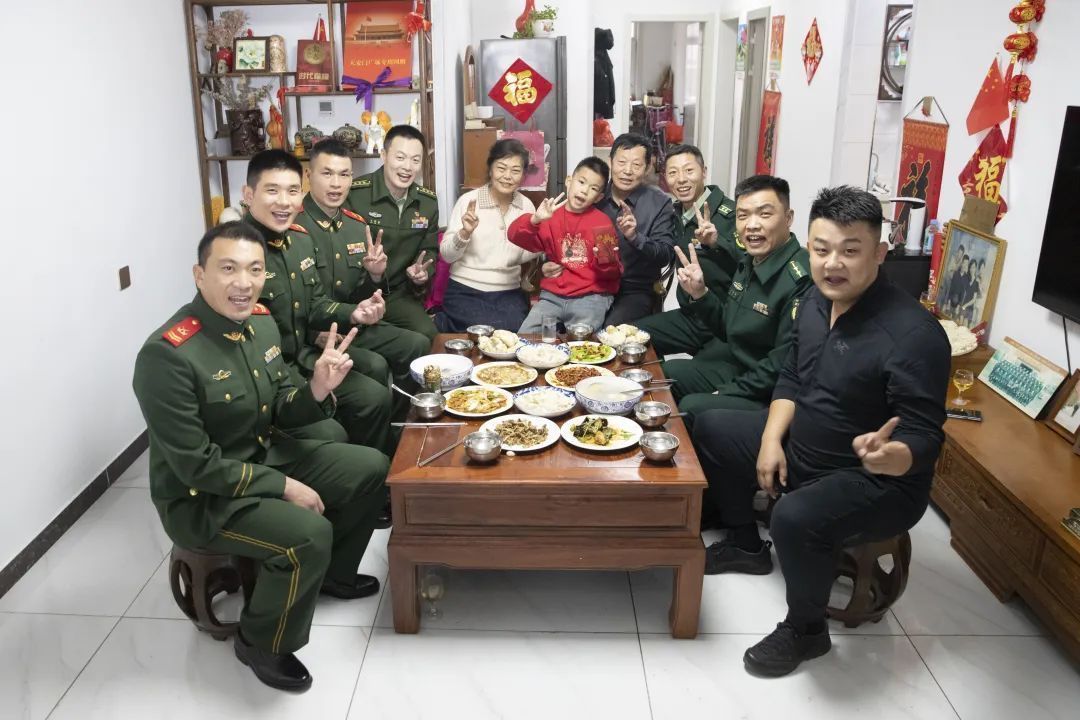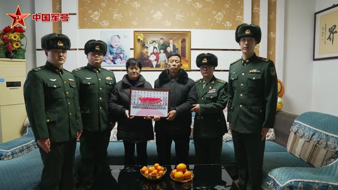 申亮亮父母手捧连队全家福,与官兵代表合影留念。杨帅 摄