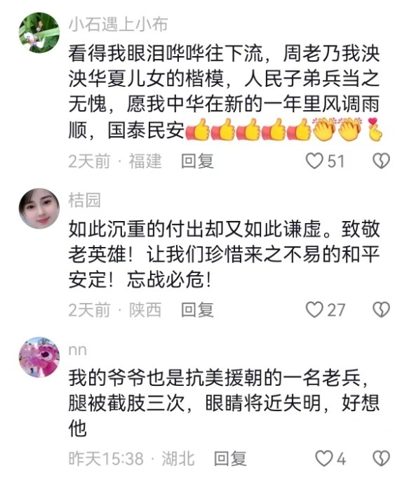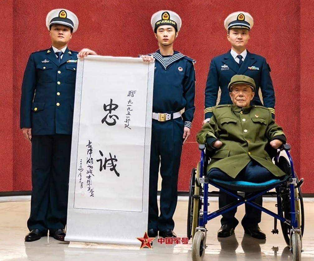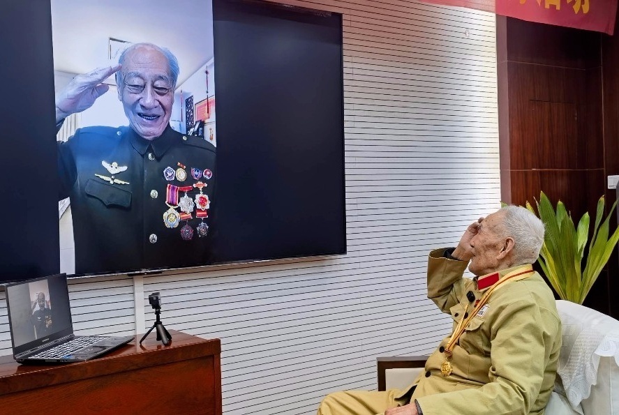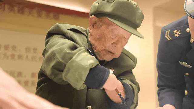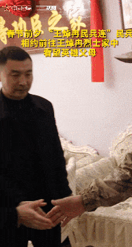 “梁山战斗英雄连”的官兵代表看望慰问志愿军老战士、一级伤残军人周全弟。唐瑞杰 摄