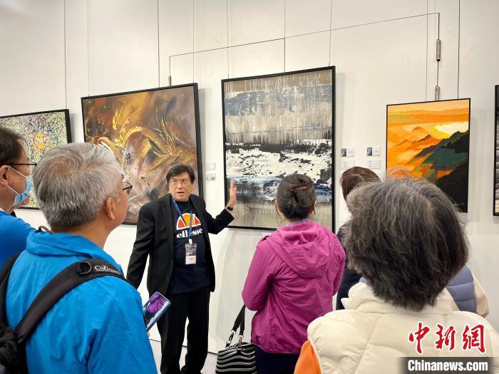 图为参展画家为观众讲解自己的作品。中新网记者 戴梦岚 摄