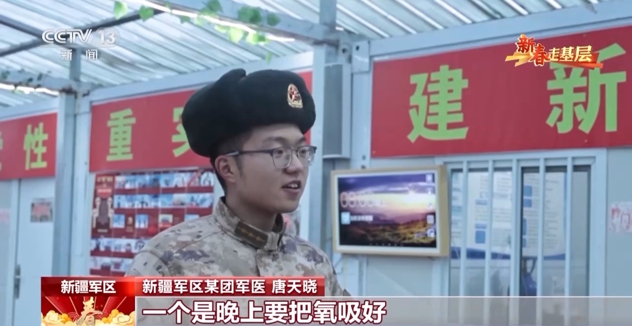 新疆军区某团军医 唐天晓:一个是晚上要把氧吸好。第二就是暖气,室内温度要保持比较合适。第三个咱不能洗澡,也不能洗头,免得感冒。如果发生感冒还是比较危险的。