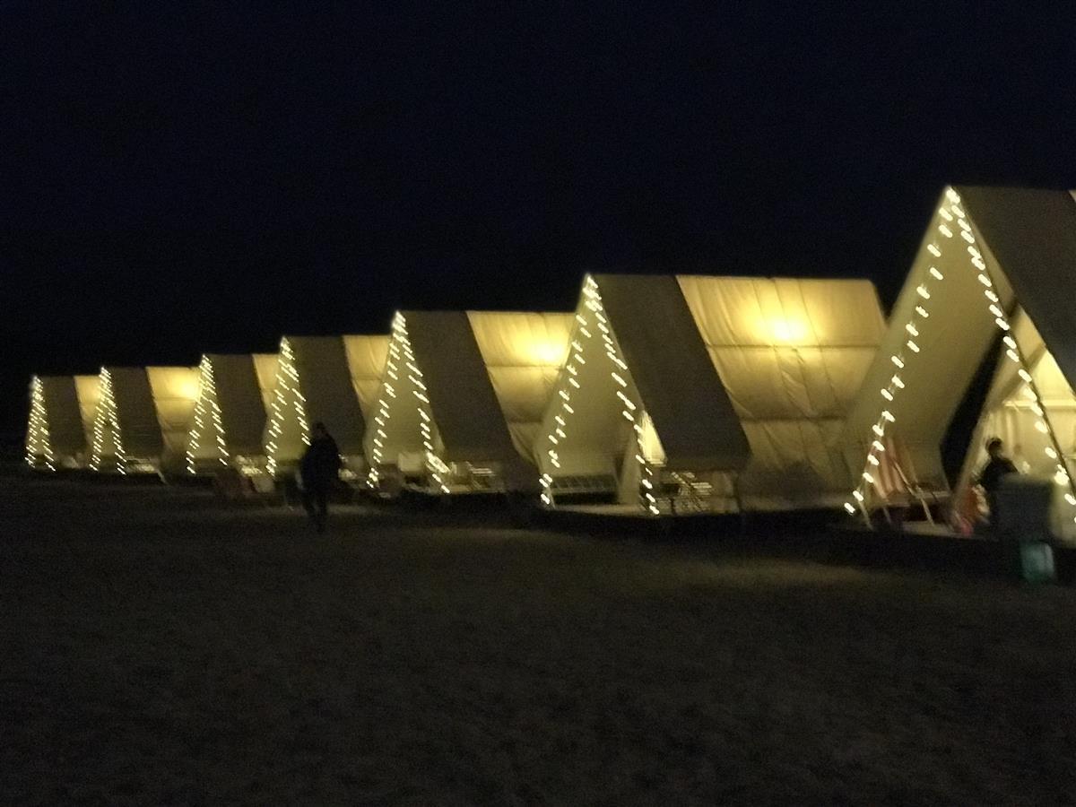 薄暮冥冥,天屿湖畔露营基地的篝火晚会开始了,游客三三两两围坐在篝火堆旁,篝火在夜晚化身跃动的橙色精灵,翩翩起舞,为游客送去新春的祝福。
