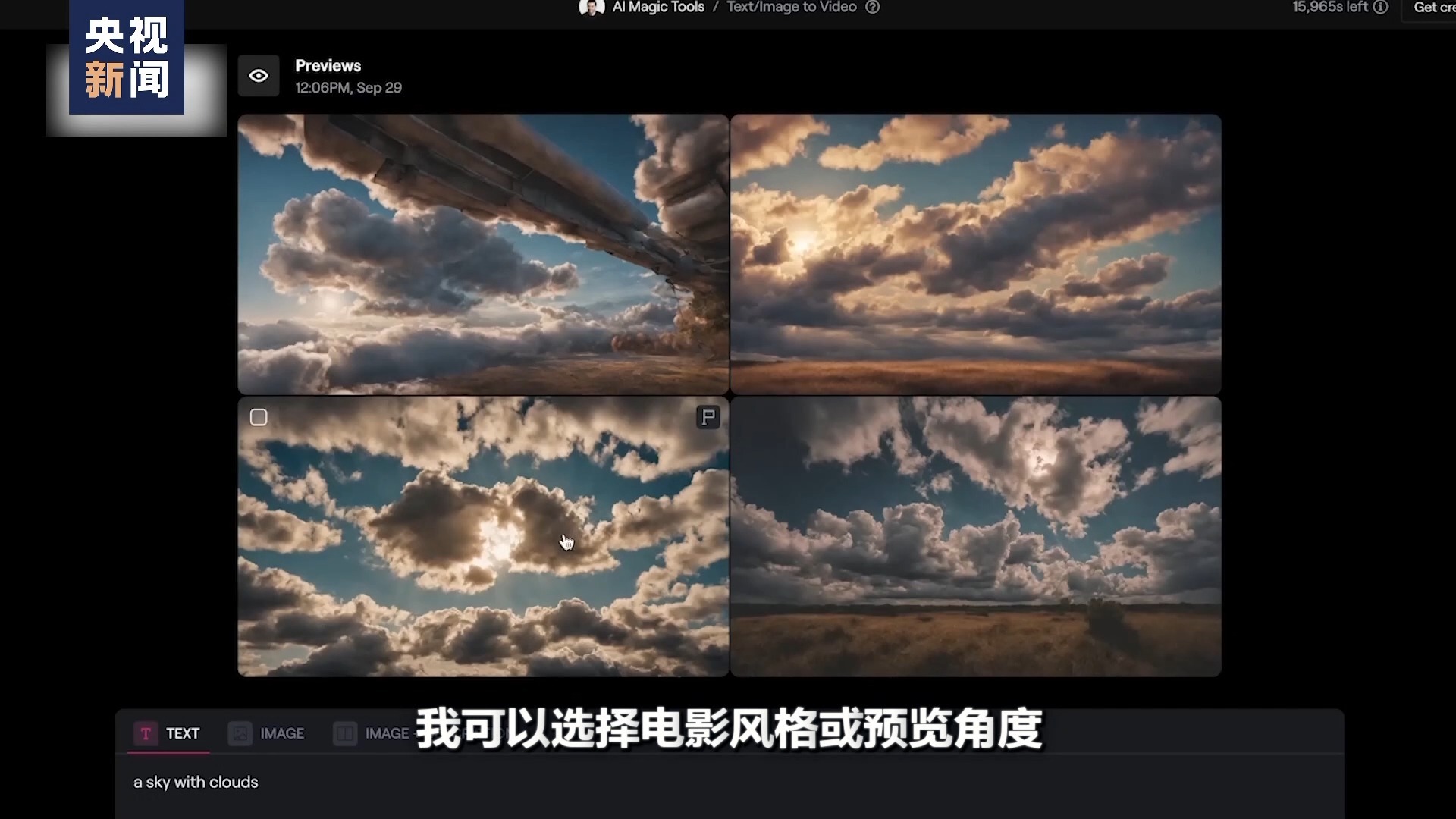 美国runway公司创始人 巴伦苏埃拉:让我们做一个有云的天空,我可以选择电影风格或预览角度。我真的很喜欢这张,它看起来就像光是从云里出来的。人工智能正在扫描图片,并由此生成一段视频。