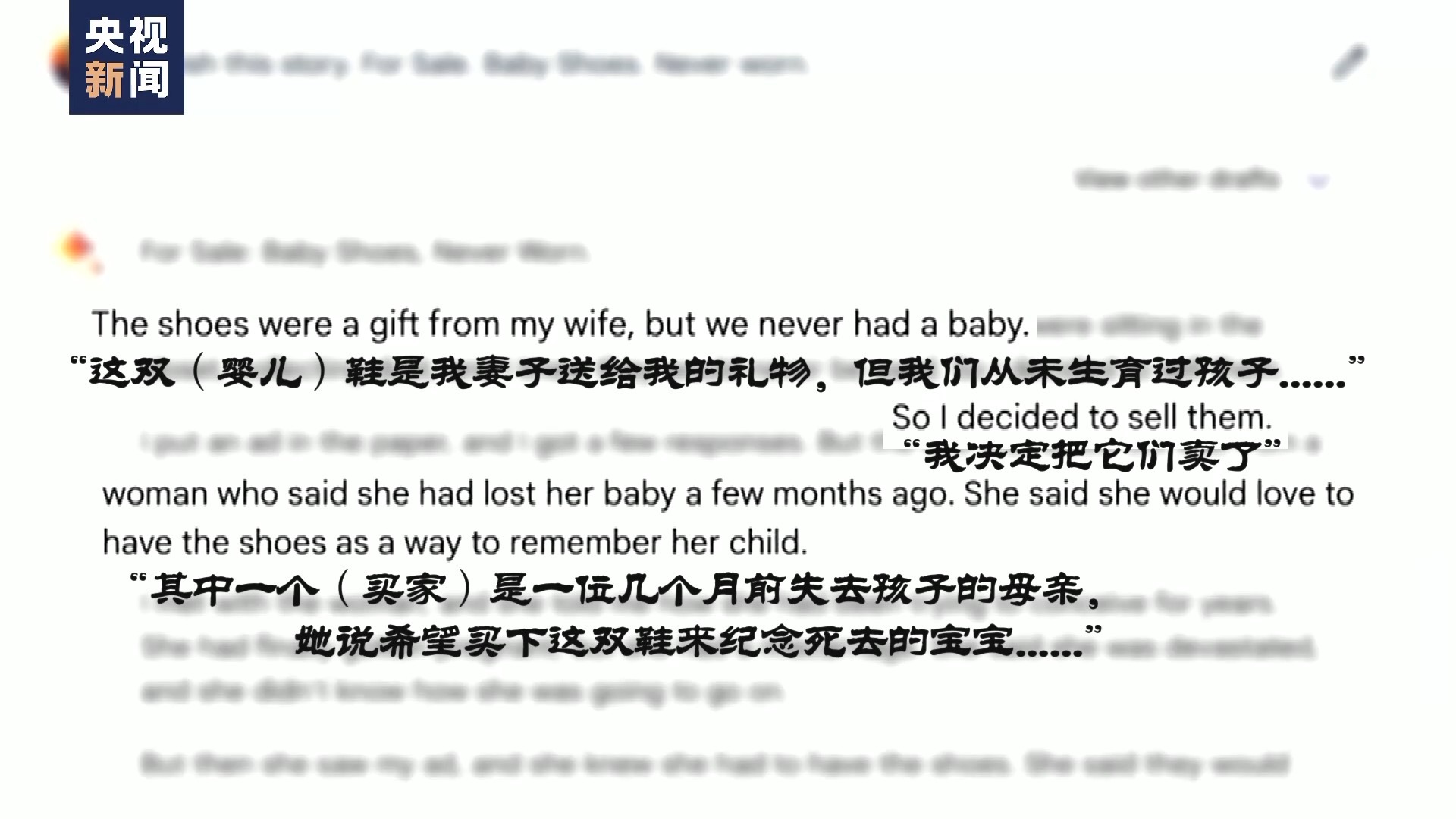 根据六个字的提示,巴德在几秒钟之内创作了一个充满人性的故事:“这双(婴儿)鞋是我妻子送给我的礼物,但我们从未生育过孩子......”“我决定把它们卖了”“其中一个(买家)是一位几个月前失去孩子的母亲,她说希望买下这双鞋来纪念死去的宝宝......”