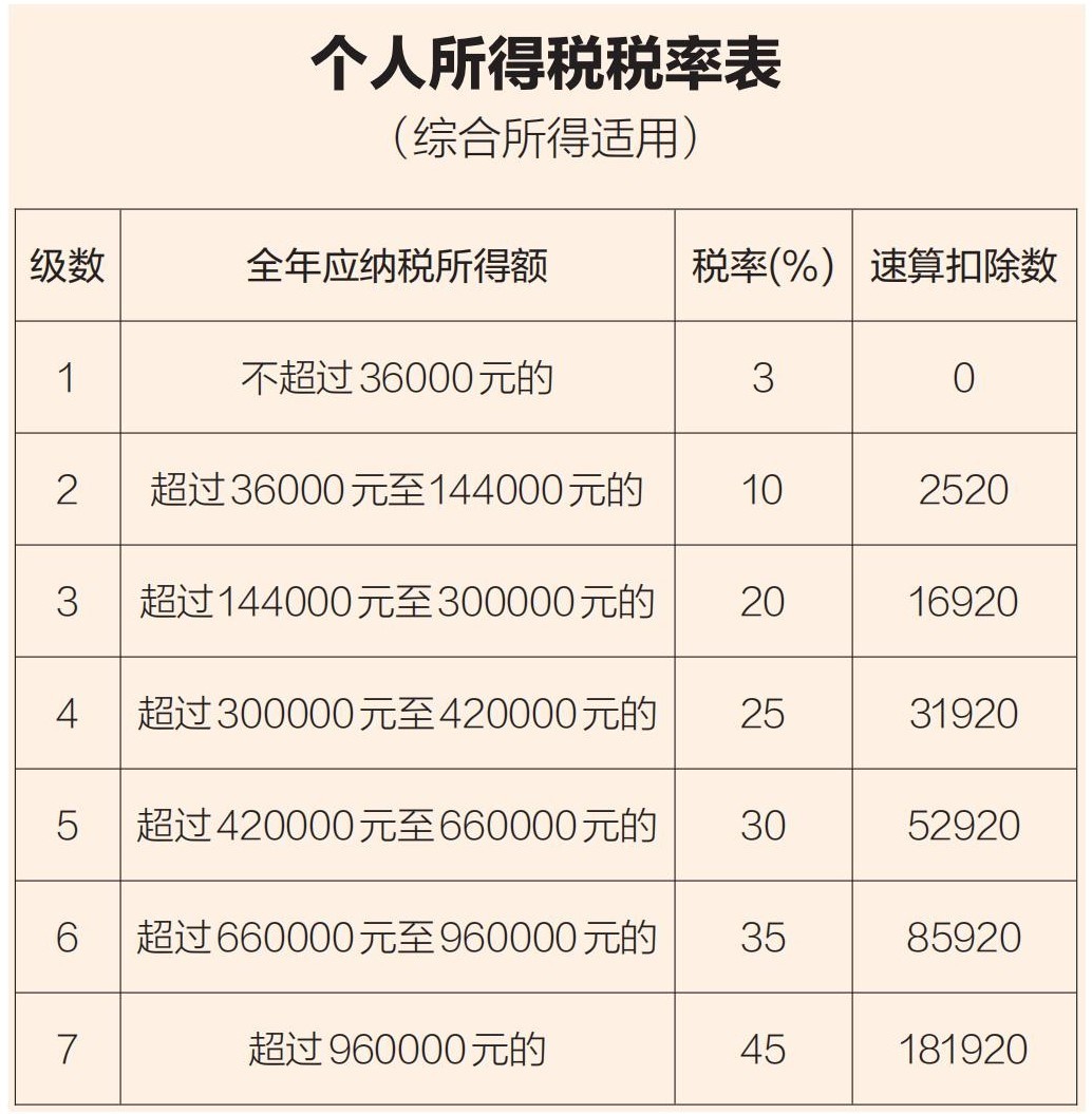 2023年度终了后,居民个人需要汇总2023年取得的工资薪金、劳务报酬、稿酬、特许权使用费等四项综合所得的收入额,减除费用6万元以及专项扣除、专项附加扣除、依法确定的其他扣除和符合条件的公益慈善事业捐赠后,适用综合所得个人所得税税率并减去速算扣除数(税率表见左图),计算最终应纳税额,再减去2023年已预缴税额,得出应退或应补税额,向税务机关申报并办理退税或补税。