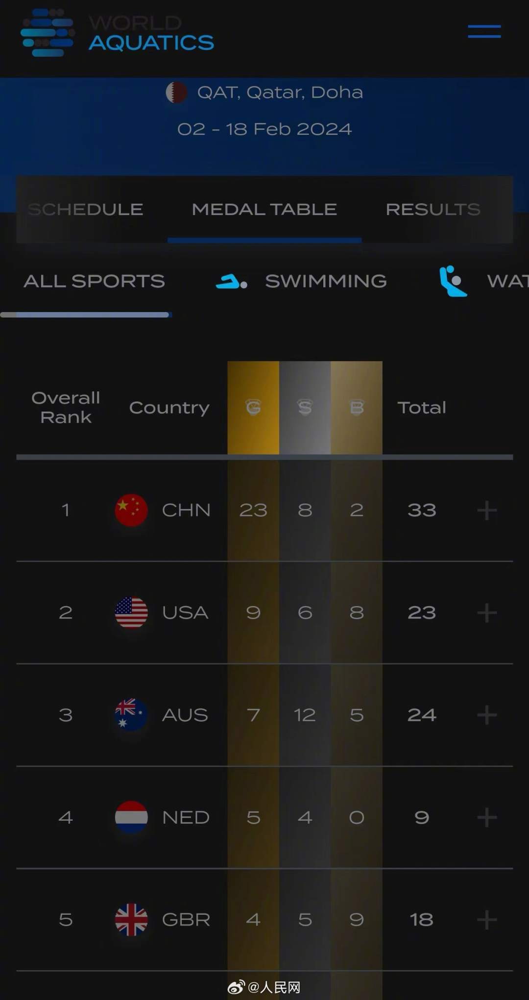 恭喜!多哈游泳世锦赛中国队获金牌榜和奖牌榜第一