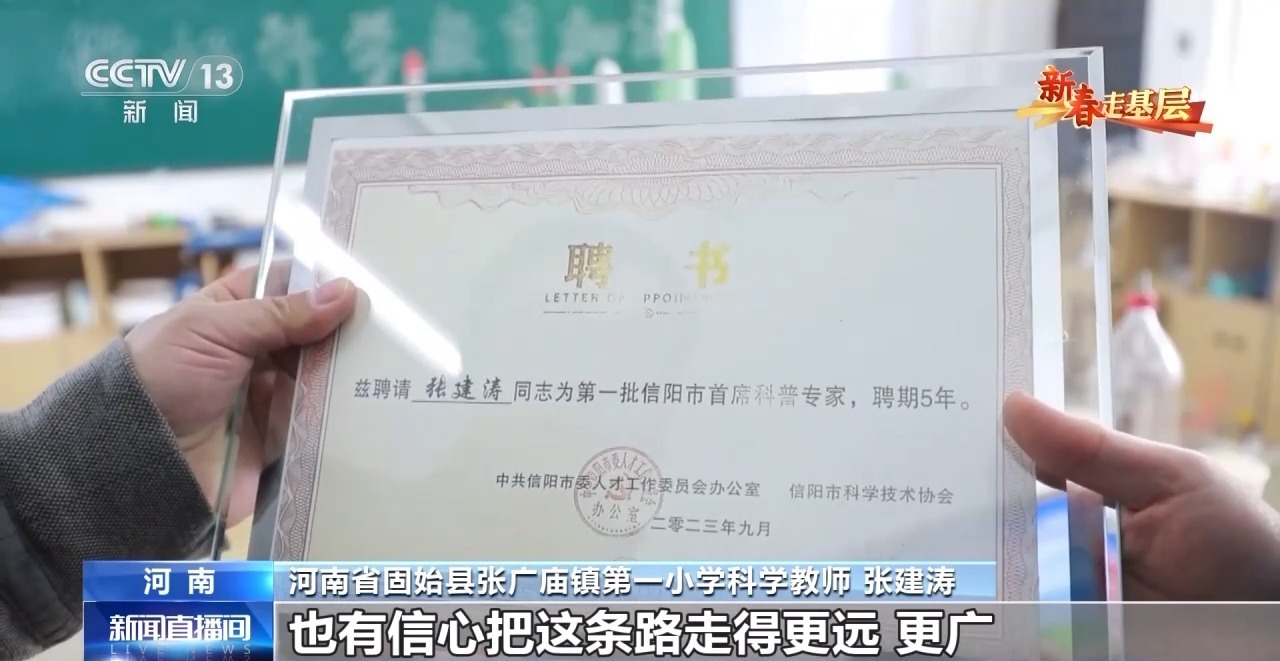 在张老师看来,科学教育影响着孩子的未来,也关乎国家的未来。上学期张建涛获得了一个新的身份——信阳市的首批科普专家,他也是唯一来自乡村的专家。