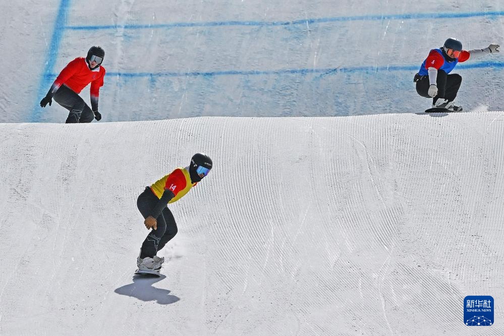 2月19日,吉林队选手叶康佳(前)、内蒙古队选手李柯新(后右)和山西队选手张彬在比赛中。新华社记者 李志鹏 摄