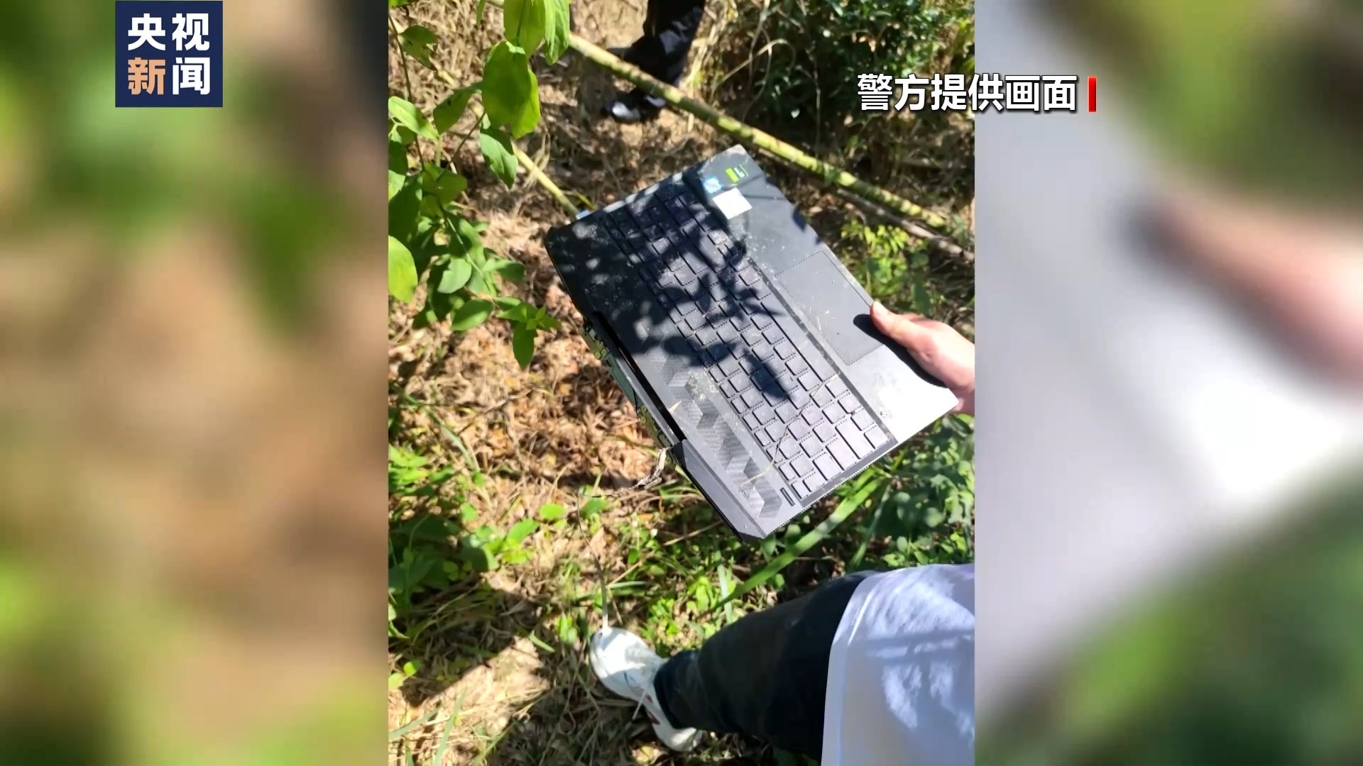 在潘某的指认下,警方继续上山寻找电脑。终于,在另一处满是杂草的山沟里,找到了潘某掰断一半的笔记本电脑。