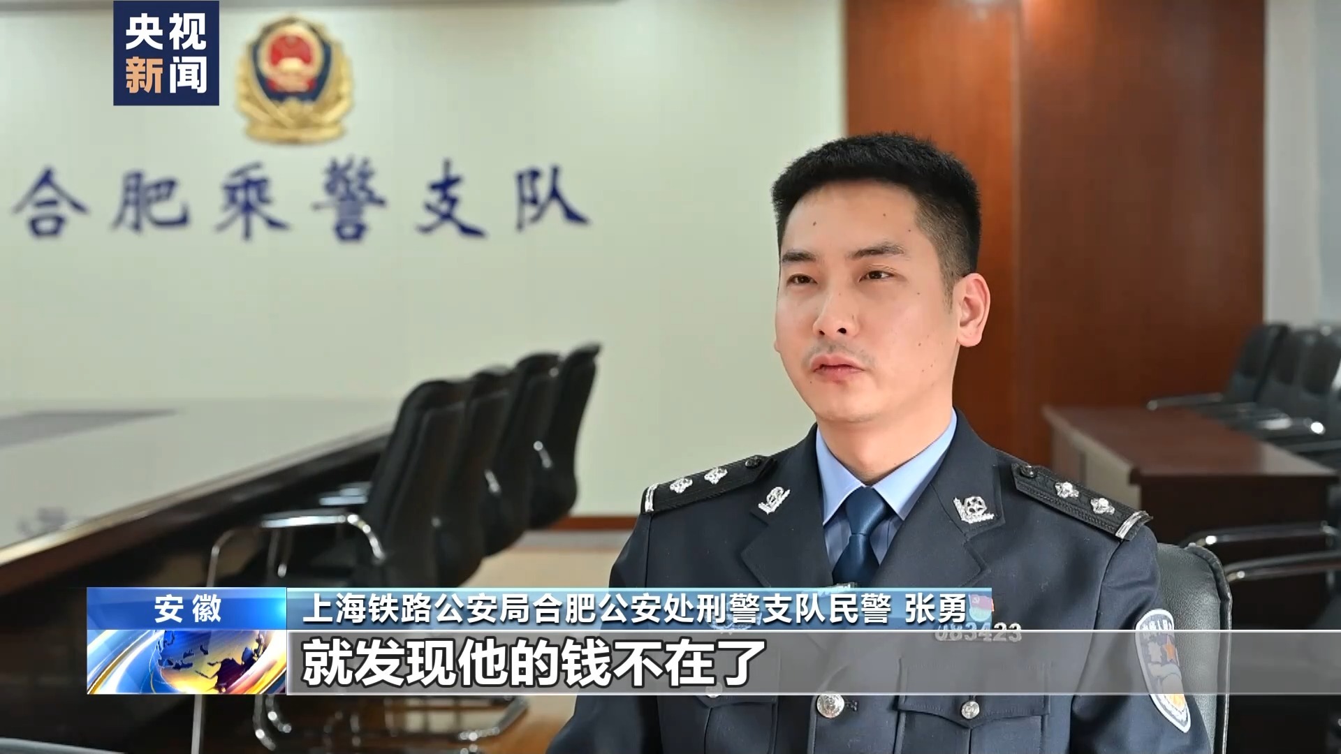上海铁路公安局合肥公安处刑警支队民警 张勇:刚上公交车后,就发现他的钱不在了,这个就排除了钱是在公交车上被偷的。他从一下高铁之后,他的背包是前背的,这就排除了他是在下高铁之后被偷的。所以综合判断,很可能是在高铁上被偷的。