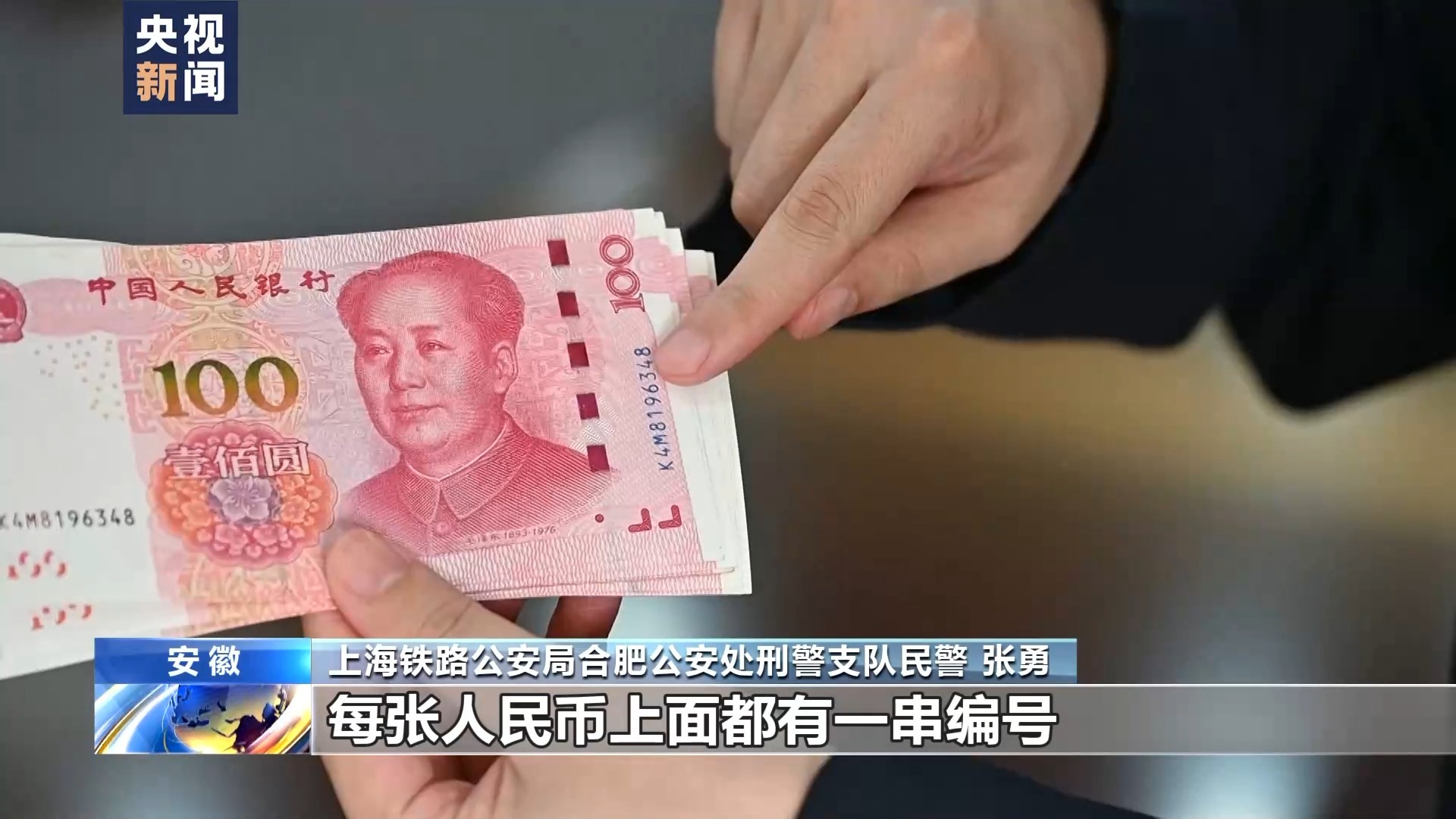 上海铁路公安局合肥公安处刑警支队民警 张勇:每张人民币上面都有一串编号,这就是冠字号,它相当于我们的身份证号码一样,都是独一无二的。如果失主丢失的人民币冠字号与我们怀疑对象所持有的人民币冠字号一致,就说明这个人有重大作案嫌疑。
