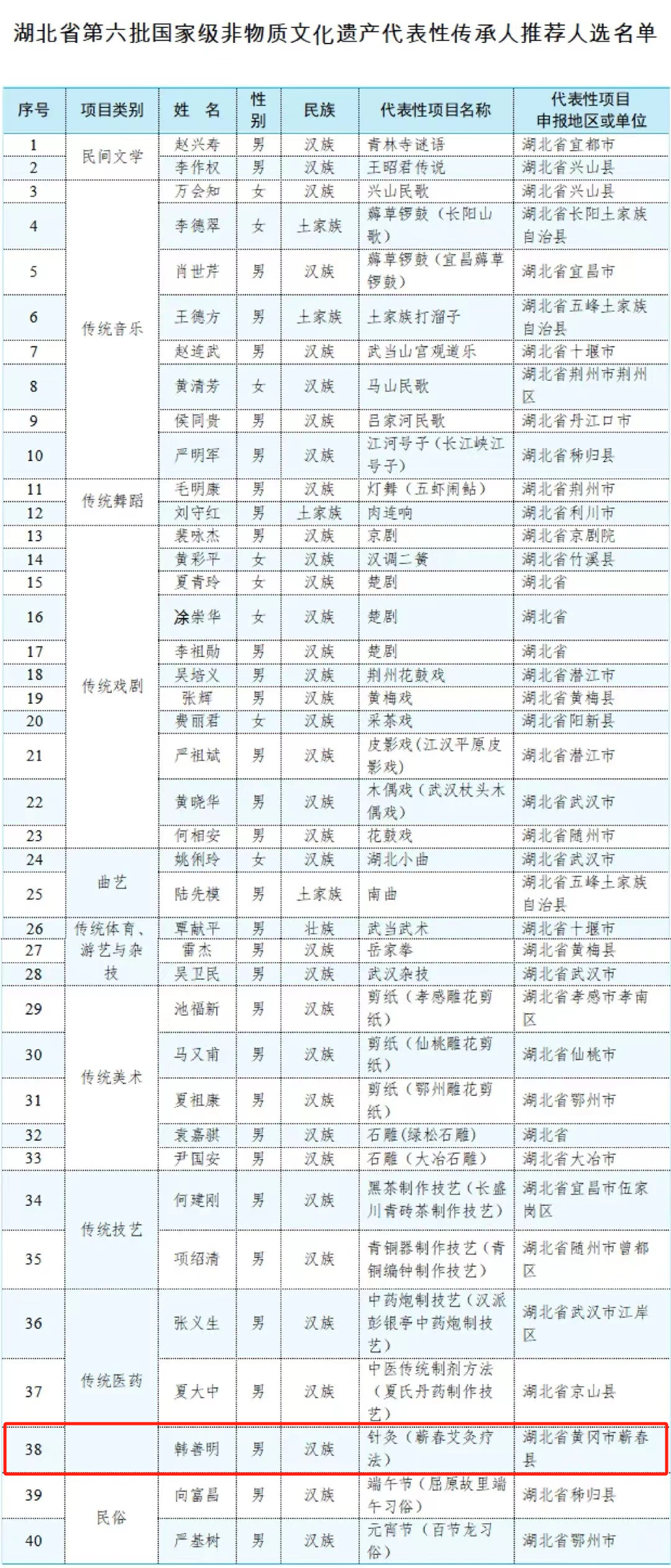 2月20日,蕲春三级干部大会传来消息,针灸(蕲春艾灸疗法)传承人韩善明成功入选第六批国家级非物质文化遗产代表性传承人推荐人选公示名单。