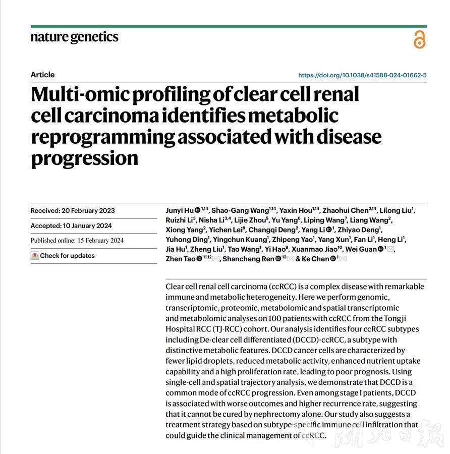 湖北日报讯(记者龙华、通讯员邓国欢)2月15日,华中科技大学附属同济医院泌尿外科谌科教授、王少刚教授、管维教授,肿瘤科陶振教授与海军军医大学附属长征医院泌尿外科任善成教授联合在国际著名期刊《Nature Genetics》(《自然-遗传学》杂志)在线发表题为《多组学揭示肾透明细胞癌疾病进展过程中的代谢重编程研究》的论文(同济医院为论文的第1作者和第1通讯单位)。该研究基于同济医院泌尿外科肾透明细胞癌临床大队列多组学数据、肾癌Ⅲ期临床试验数据和TCGA等肾癌公共数据的联合分析,创新性地建立了肾透明细胞癌新的分子分型诊疗体系,揭示了肾透明细胞癌去透明细胞分化的广泛恶性进展模式。