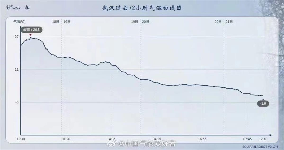 气象监测显示,18日午后武汉达到26.8℃,今日(21日)午间12时就低至-1.9℃。