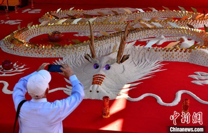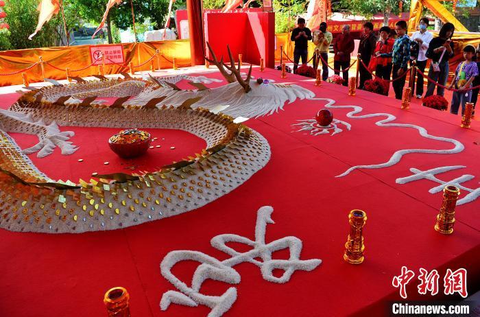 2月21日,巨型“米龙”吸引市民前来参观。当天,“米龙”祈福活动在福建泉州文兴宫启动,将持续到农历二月初二,届时制作“米龙”的平安米将让民众带回家,一起“呷(吃)平安”。“米龙”总长度35米,使用了3500斤大米,由台湾师傅制作,历时三天。