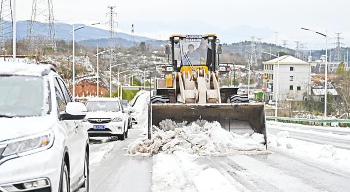 2月21日,气温零下2摄氏度,宜都市G241国道上,保畅人员正驾驶平地机快速清除路面积雪。