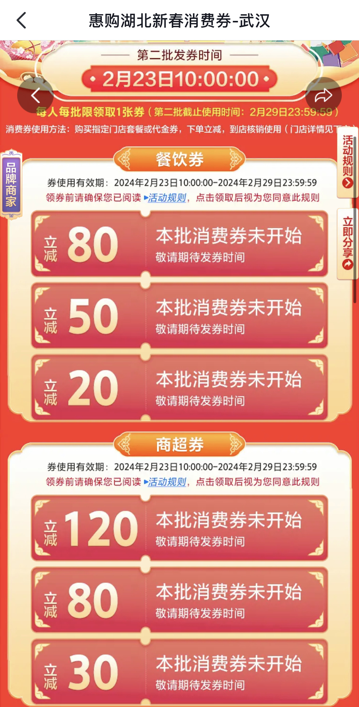 据介绍,过年期间,湖北省安排财政资金2亿元,用于发放“惠购湖北”新春消费券(以下简称“惠购湖北”新春消费券)。第一轮第一批次消费券已于2月13日(大年初四)10:00至2月19日(大年初十)24:00投放完毕,第一轮第二批次将于2月23日10:00至2月29日24:00投放使用。