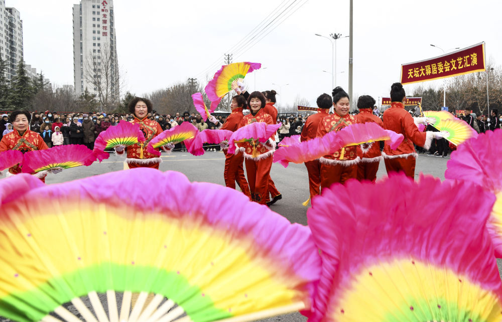 2月22日,河南省济源市天坛街道的民间艺人在表演扇子舞。新华社发(苗秋闹摄)
