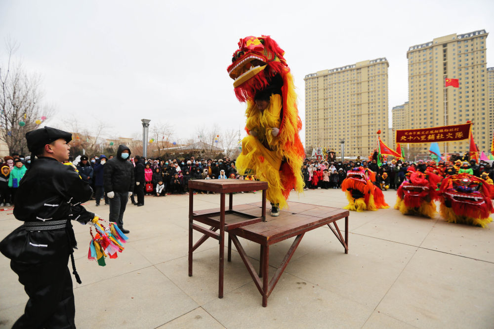 2月22日,社火队在甘肃省定西市安定区市民公园表演舞狮。新华社发(王克贤摄)