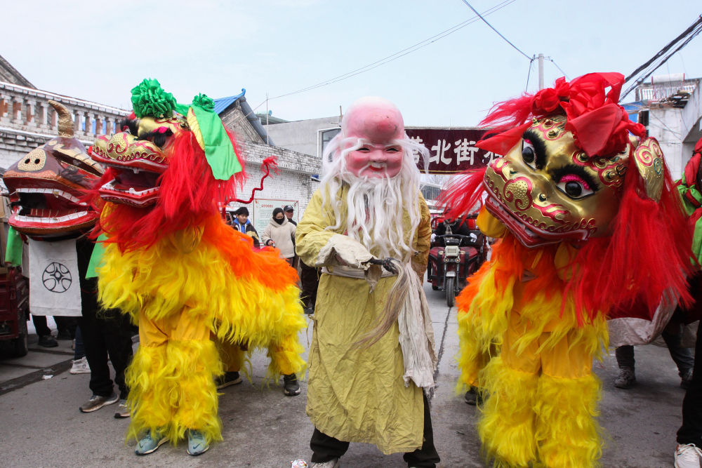2月22日,在河南省博爱县北朱营村,村里的文艺队在表演舞狮。新华社发(程全摄)