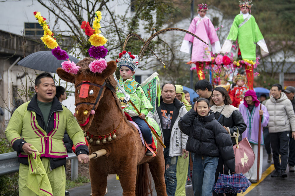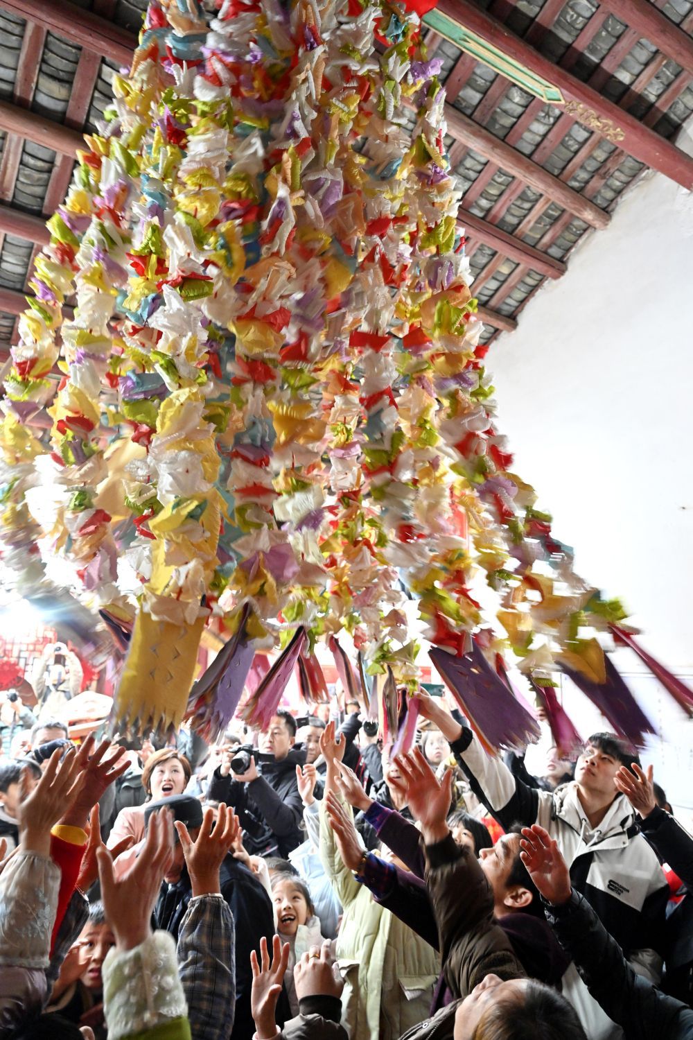 2月22日,在浙江省金华市武义县俞源乡俞源古村,村民在举行传统民俗活动“擎台阁”。新华社发(胡肖飞摄)