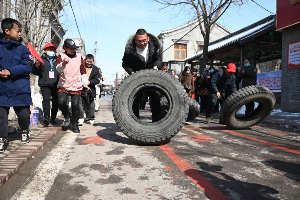 2月22日,村民在河北省邯郸市邯山区河沙镇镇南街村参加翻轮胎比赛。新华社发(胡清华摄)