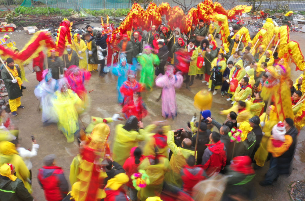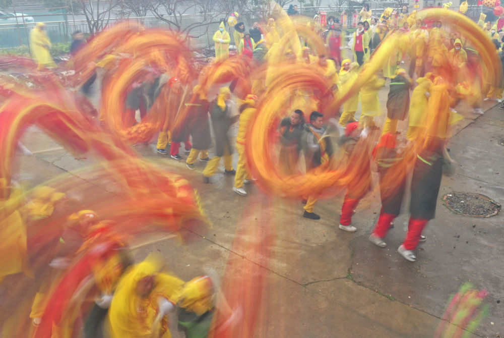 2月22日,村民在湖南省衡阳市蒸湘区呆鹰岭镇表演舞龙。新华社发(曹正平摄)