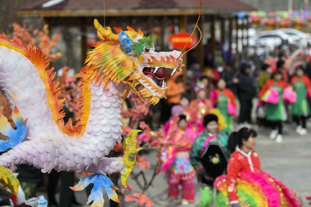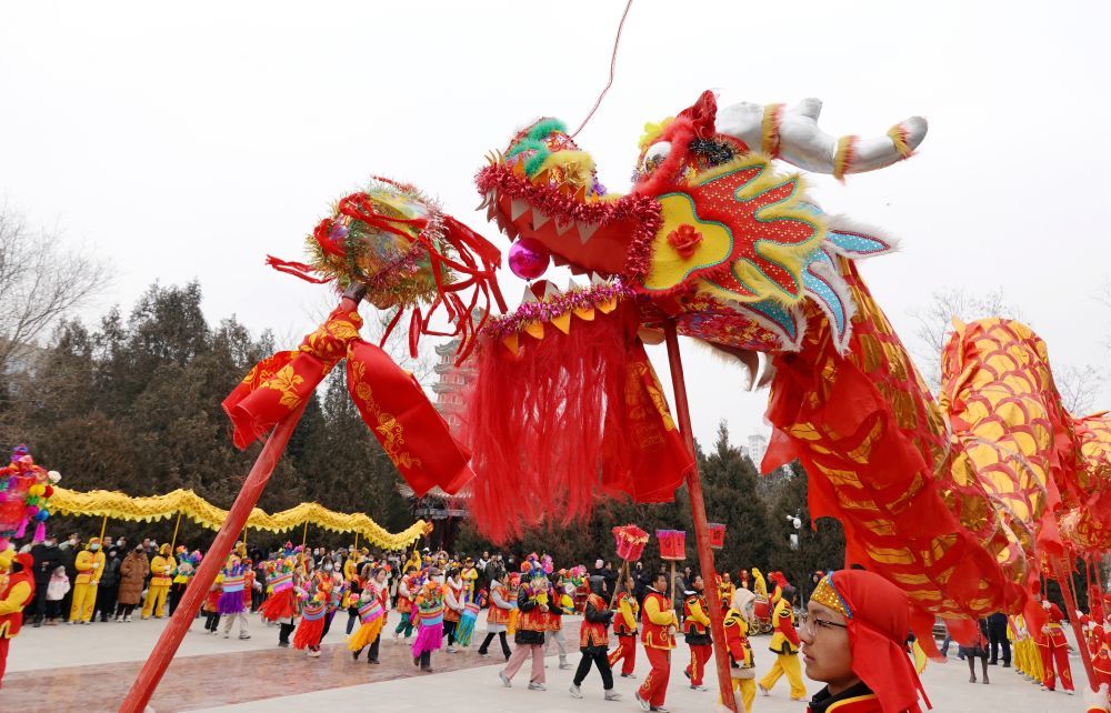 2月22日,社火队员在甘肃省定西市安定区市民公园表演舞龙。新华社发(王克贤摄)