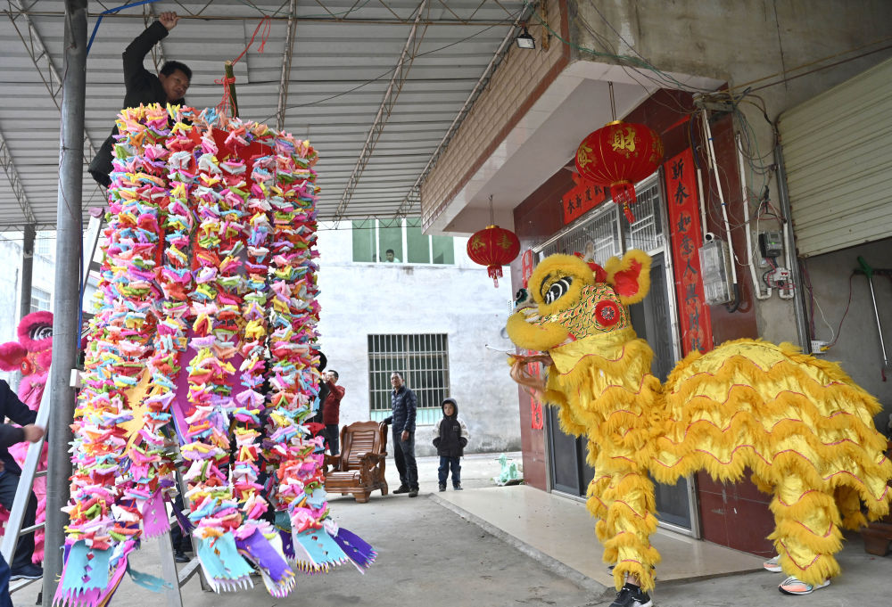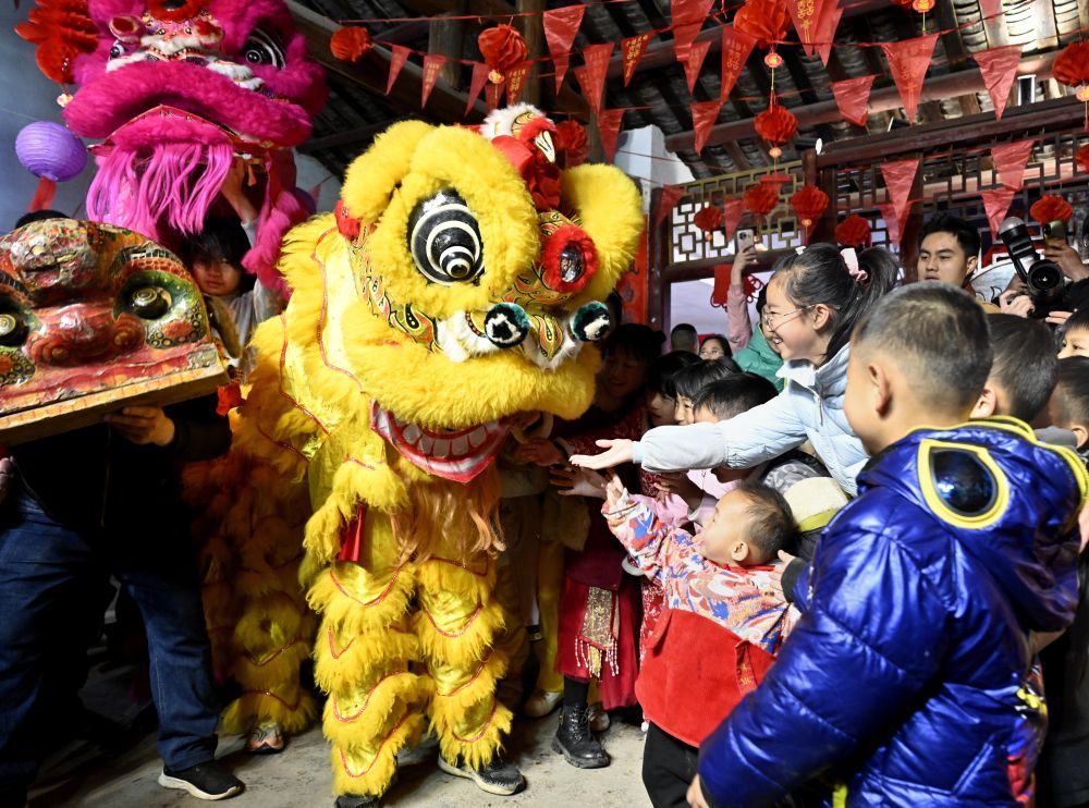 2月22日,广西柳州市柳江区进德镇举行“上花灯”系列民俗闹元宵活动。这是舞狮艺人向小朋友派发礼物。新华社发(黎寒池摄)