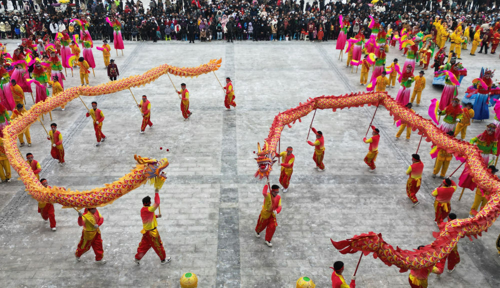 2月22日,民间艺人在甘肃省和政县聚兴广场表演舞龙(无人机照片)。新华社发(史有东摄)
