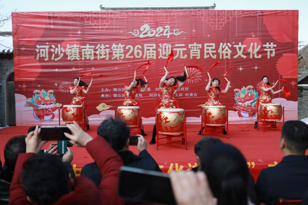 2月22日,村民在河北省邯郸市邯山区河沙镇镇南街村表演《网红战鼓》。新华社发(胡清华摄)