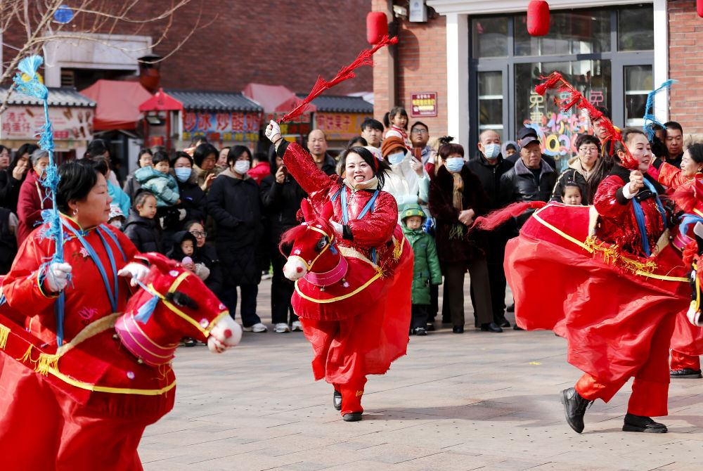 2月22日,社火队在山西省临汾市襄汾县丁陶风情街表演竹马。新华社发(李现俊摄)